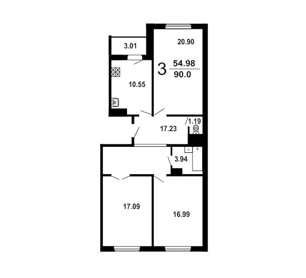 3-ком. квартира: 90,00/ 54,98/ 10,55 кв. м