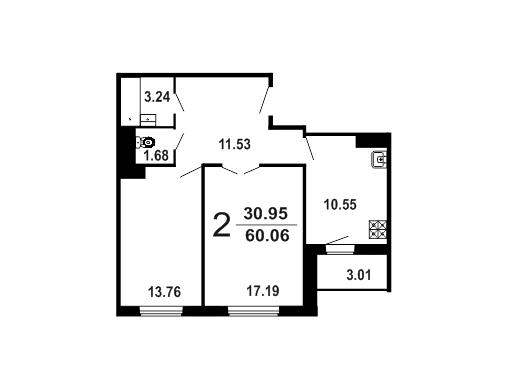 2-ком. квартира: 60,06 / 30,95 / 10,55 кв. м