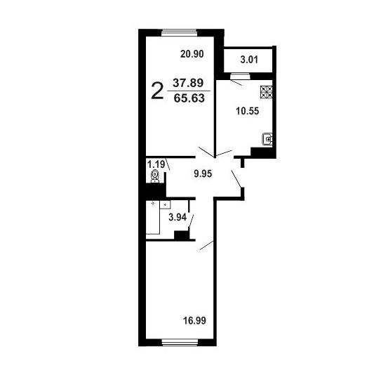 2-ком. квартира: 65,25 / 37,89 / 10,55 кв. м
